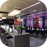 La cuisine située en position centrale est entièrement vitrée sur la salle.